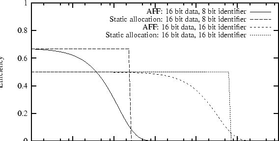 Clearly, AFF does not help in networks that do not exhibit locality. If the optimum number of bits needed by AFF is the same as the number of bits required for globally unique static allocation, traditional static allocation will always be better. This point is illustrated in Figure 3. The figure shows our model from a different perspective, describing how efficiency of the network changes as the load on it increases.